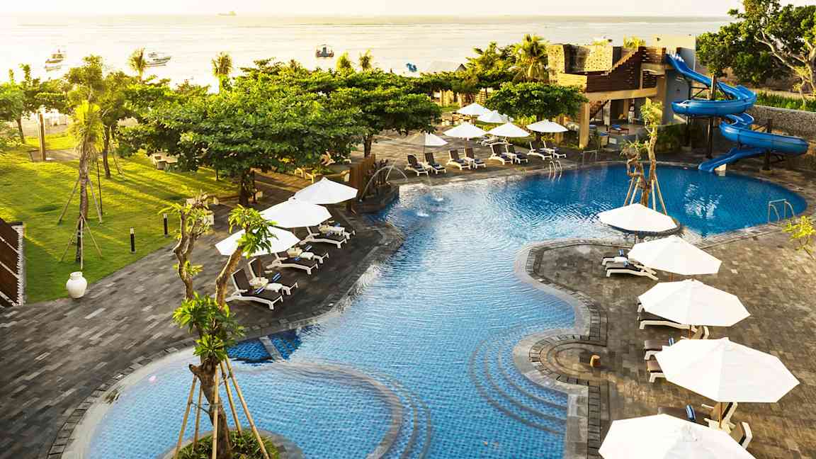 Ving erbjuder ett stort antal hotell att välja mellan när du bokar din resa till Indonesien och Bali. Här finns allt från enkla hotell med två vågor till exklusiva lyxhotell med fem vågor. En lång rad hotell har direkt strandläge, och majoriteten har pool. Ska du resa med barn till Bali rekommenderar vi särskilt det barnvänliga hotellet Bali Dynasty Resort som kan stoltsera med såväl lekrum och lekplats som barnklubb och vattenrutschbanor.